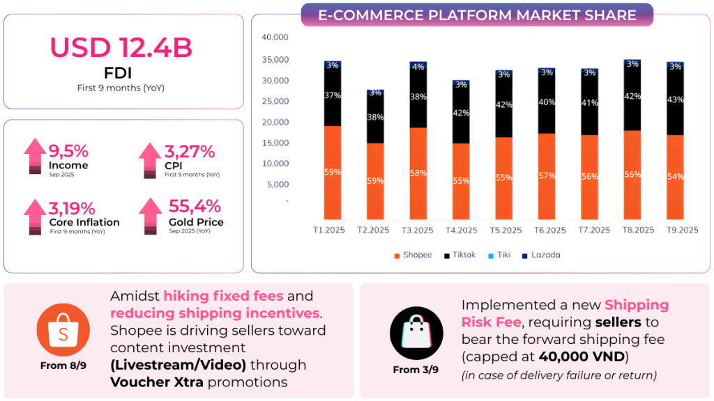 Newly registered FDI in the first nine months of 2025 reached USD 12.4 billion, while CPI rose 3.27% YoY. Meanwhile, gold prices climbed more than 55% YoY—suggesting consumers are prioritizing holding cash and safe-haven assets rather than spending on non-essential items.