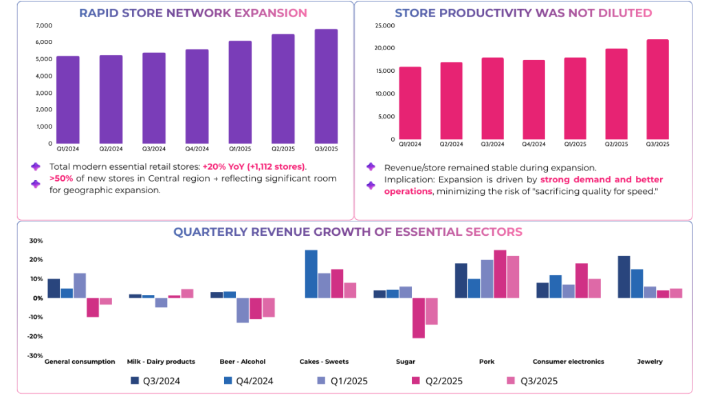 The number of modern essential-goods stores is up 20% YoY (an increase of +1,112 stores), with over 50% concentrated in the Central region—indicating significant room for regional expansion.